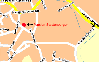 Our pension lies directly in the centre of Niederalteich. On the other side of the street there's the Raiffaisenbank. A food store, a brancho of the Sparkasse, a bakery, cafe, the ferry of Niederalteich, the church and the monastry of Niederalteich can be found within a radius of 100m.